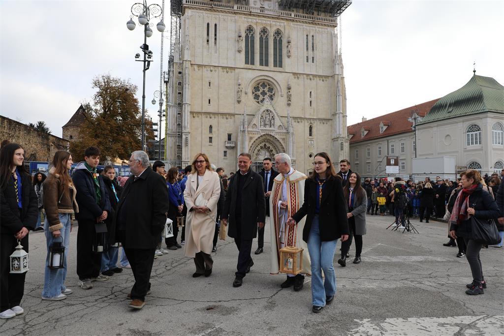 Betlehemsko svjetlo dočekali su kanonik Prvostolnog kaptola zagrebačkog preč. Josip Kuhtić i predsjednik Hrvatskog sabora Gordan Jandroković te ga, u zajedništvu s izviđačima, unijeli u Bogoslužni prostor bl. Alojzija Stepinca, ispred kojeg ih je dočekao rektor katedrale mons. Zlatko Koren.